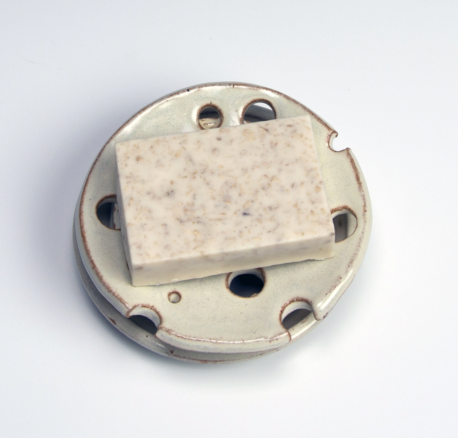 Round light blue soap dish with handmade oatmeal soap